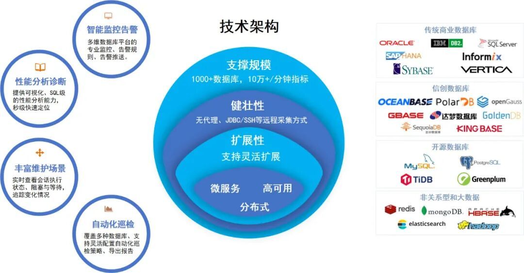 轻松实现异构数据库统一管理。提供企业数据库的全栈运维管理能力,包括各类信创数据库、传统商业及开源数据库的专业监控、性能分析、自动化操作等,将DBA重复的日常运维工作通过平台固化、自动化,大幅提升运维效率与应用系统运行质量。