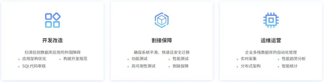 助力企业信创数据库全生命周期落地。针对企业应用特点进行信创数据库选型评估与测试,为项目实施提供开发改造、割接保障、运维运营的全程护航服务,协助企业将应用安全、平滑、快速地迁移至信创数据库中,且有效保障迁移后数据库的持续平稳运行。