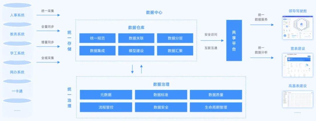 通过数据中心、数据治理、数据应用三大模块,实现高校各种业务数据、日志数据的统一管理、数据质量及价值的提升,打造数据共享、数据分析应用等能力,助力高校智慧校园建设。